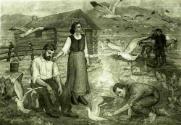 DescriptionA dejected man sits on a rock to the left. His wife stands beside him on the right. A young man is crawling barefoot on right facing left touching a seagull. Two men are working at right middleground. Seagulls swarm over the area. A cabin sits to the left, middleground. Mountains are visible in the background.On View