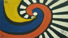 DescriptionThe image is an abstract design consisting of a large swirl pattern on the left side of the support comprised of yellow, blue, and red; on the right side of the support black and white stripes create a sunburst pattern radiating from the center curl of the swirl.On View