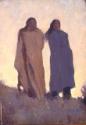 DescriptionStanding on a rise of ground covered in dry grasses two male figures appear starkly against the sky. The figure on the left is wrapped in a tan blanket, the figure on the right in a violet blue blanket. Both have long loose hair.On View