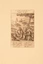 DescriptionText boxes above and below image. Image consists of masses of people sitting in a field each being given loaves. In the immediate foreground LRC is a cluster of men and one man with light around his head hold two loaves in his hands. Above them is a large tree and in the background is a body of water and a boat.On View